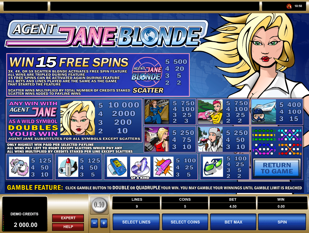 Agent Jane Blonde slot has 5 reels as well as 9 pay-line video slot, made in 2008. Certainly, game must be labeled as established.