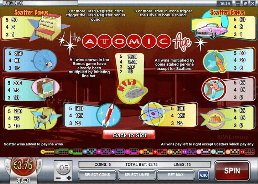 Atomic Age slot has 5-reel and 15 paylines video online slot machine, made in 2012. Definitely, online game can be labeled as old but gold.