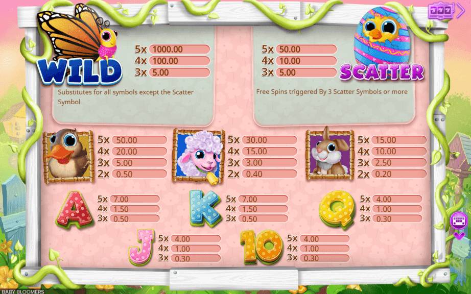 Baby Bloomers slot is about Animal topic, though you will be able to find components from Farm, Cartoon, Paradise thematics as well. Undoubtedly, in case you take delight in at least one of previously mentioned online slot machine thematics – experience from discovering all features of this slot will be really wonderful.