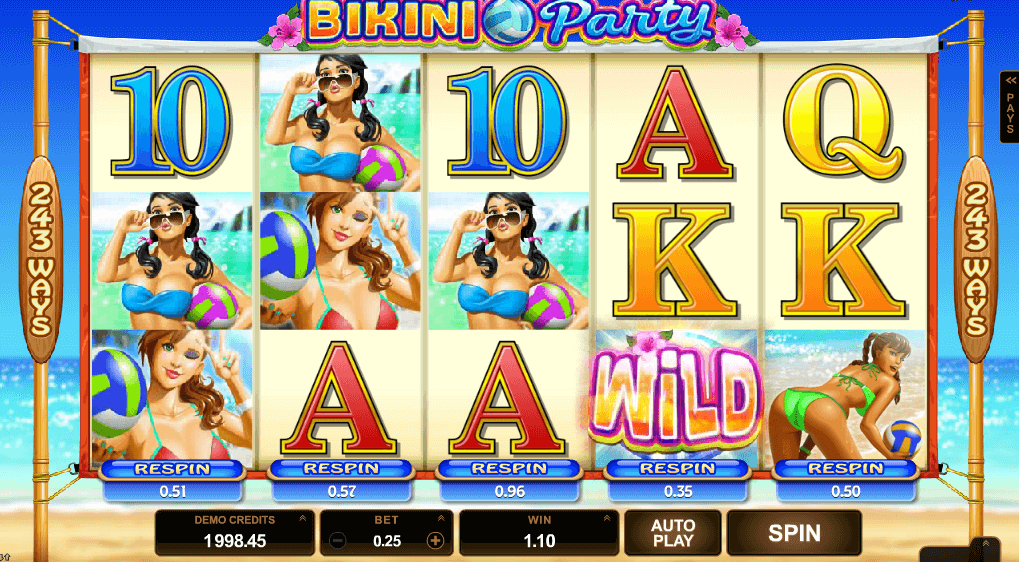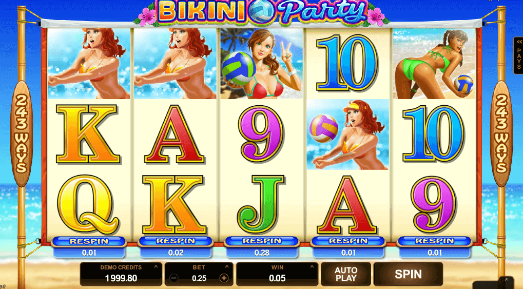 - Spot three Scatters minimum to avail Bikini Party free spins. It is possible to re-activate this feature and get 15 more spins.