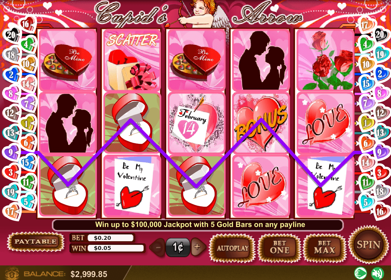 Cupid’s Arrow slot has 5-reel and 25 paylines video online slot, made in 2013. Definitely, online game could be marked as old but gold.