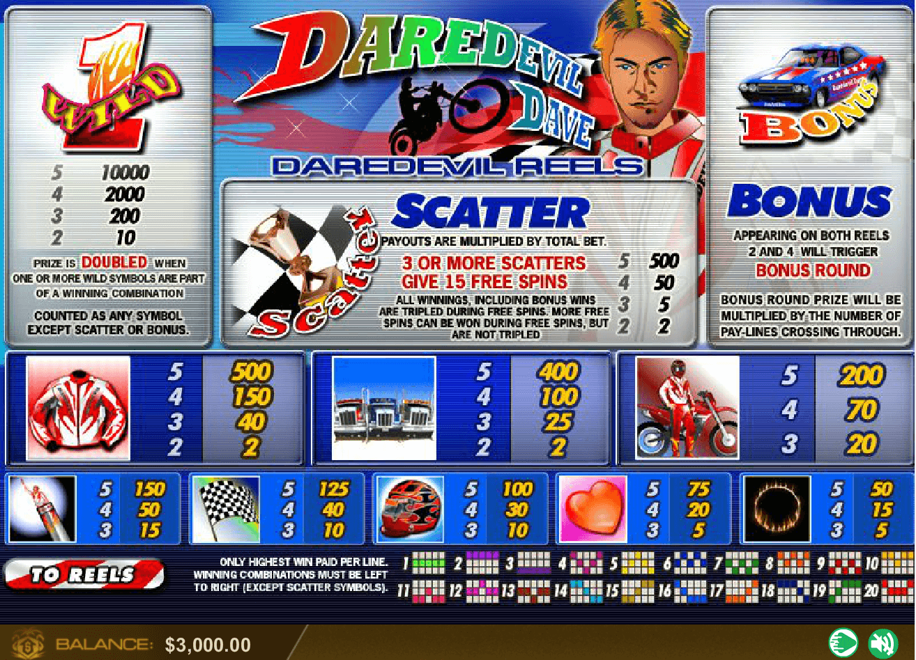 Daredevil Dave slot is a 5 reels as well as 20 paylines video online slot, launched in 2013. Surely, casino game must be named as well-established.