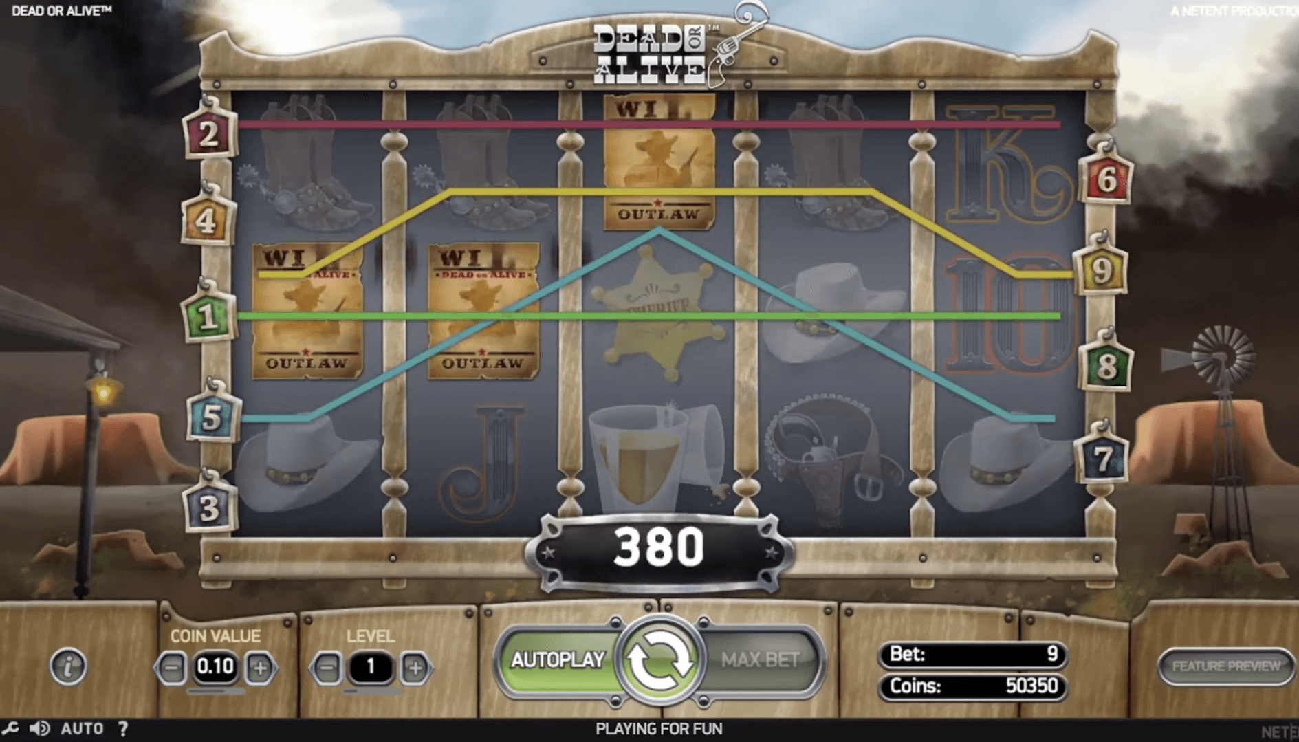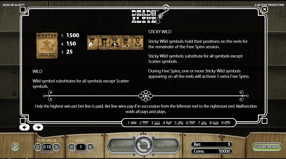 Dead or Alive slot has 5 reels as well as 9 paylines video slot machine, launched in 2013. Surely, game could be labeled as well-established.