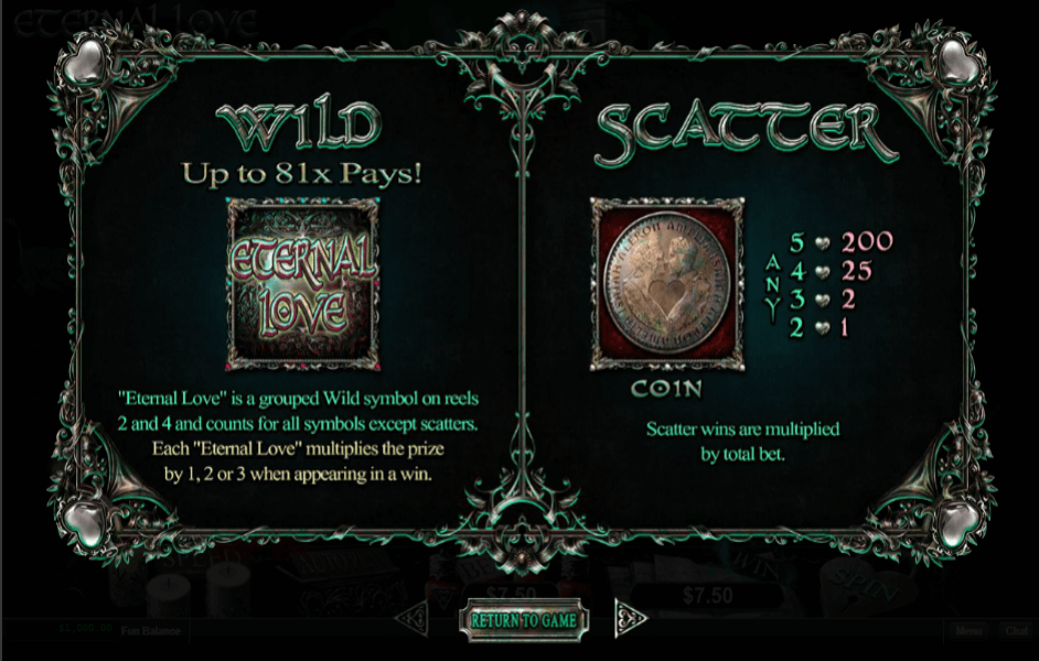 - The scatter symbol of the game is the coin image logo, which pays off 200, 25, 2 and 1 coin on appearing 5, 4, 3, and 2 times respectively. When 3 or more scatter appears, 10 Eternal Love free spins are awarded.