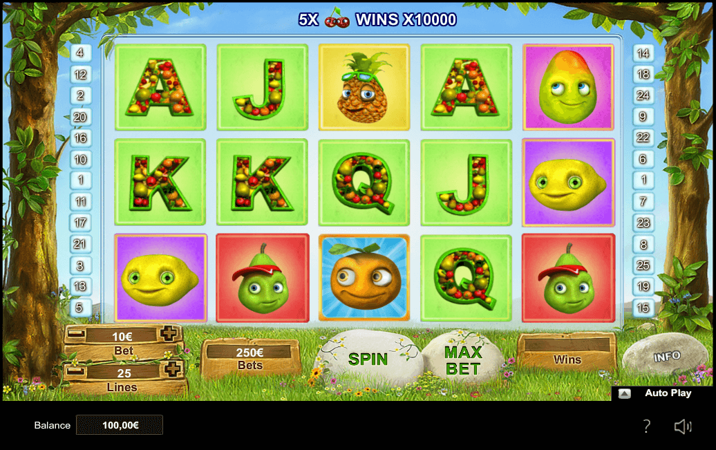 Fruity Friends review developed by NeoGames is a 5-reel slot game with 25 paylines, was established in 2012. The RTP in this game is 93% with a top jackpot of 10,000 coins at an utmost bet of 250 coins.
