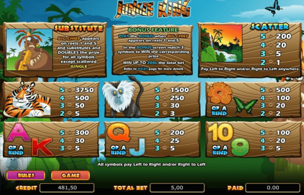Jungle King slot is about Animal theme, but nevertheless you will be able to notice elements of Wild, Jungle, Tiger topics too. Surely, if you derive pleasure from these latter slot machine thematics – enjoyment from discovering all features of this online slot machine will be really wonderful.