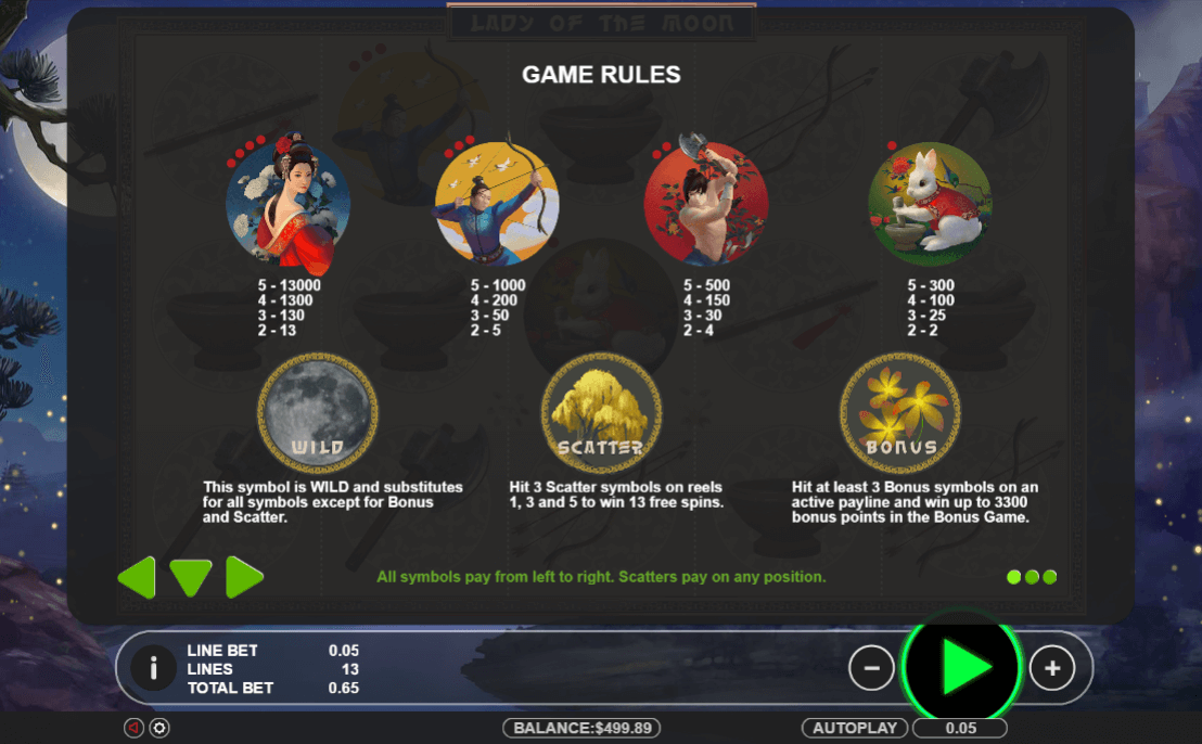 - Scatters: The scatter symbol in the game is an image of a flower, which appears across the main reel. The purpose of scattering is to activate Lady of the Moon free spins in the main game, and gives out 13 fixed free spins while appearing on reels 1, 3, and 5 respectively.