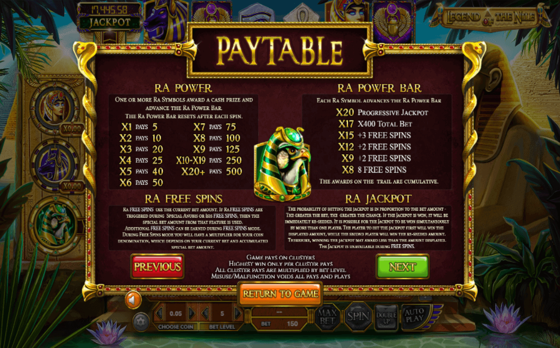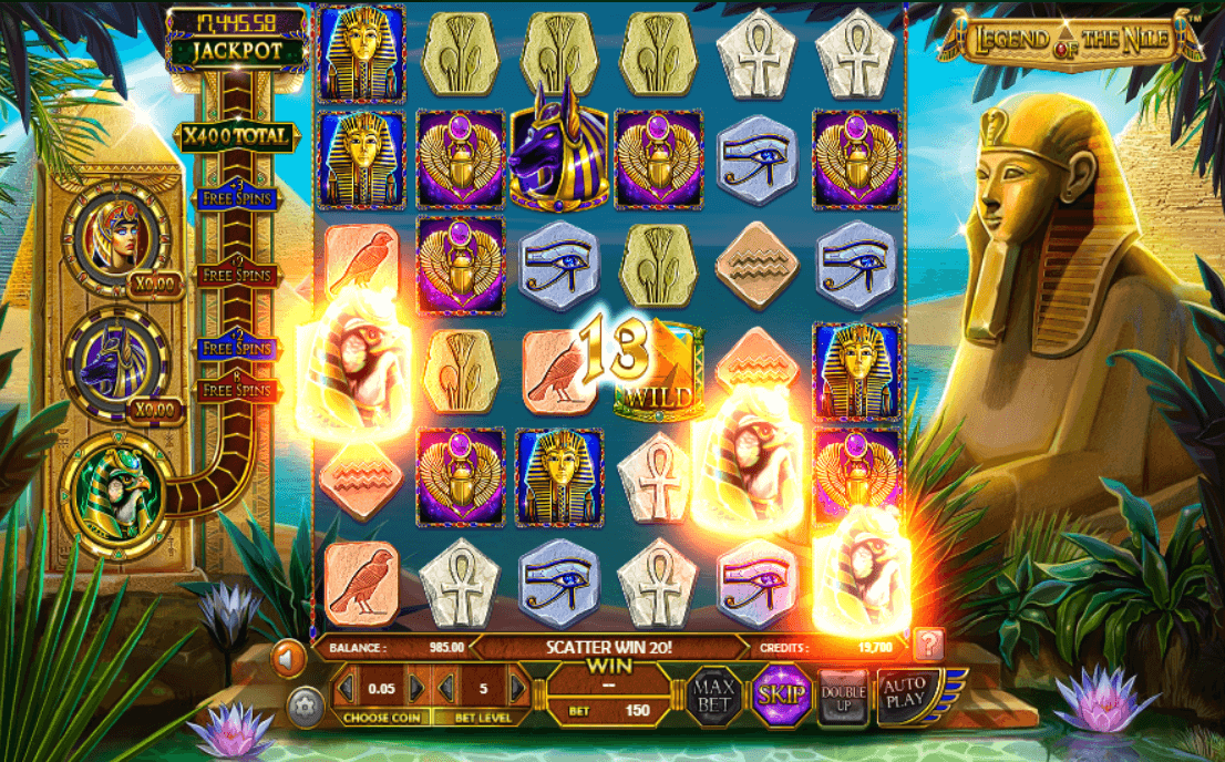 - Similarly, there are Legend of the Nile free spins and jackpots if you collect different numbers of Pyramid, Ra, Anubis or Isis symbols. The slot is progressive, which makes the game extremely exciting.