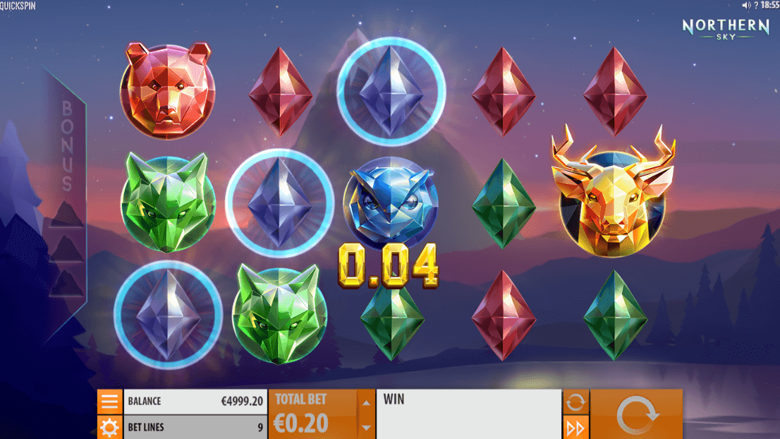 The symbols of Northern Sky slot are animal-shaped. They look like colored crystals that lights up the sky. Northern Sky review reveals the following symbols and features of the game.