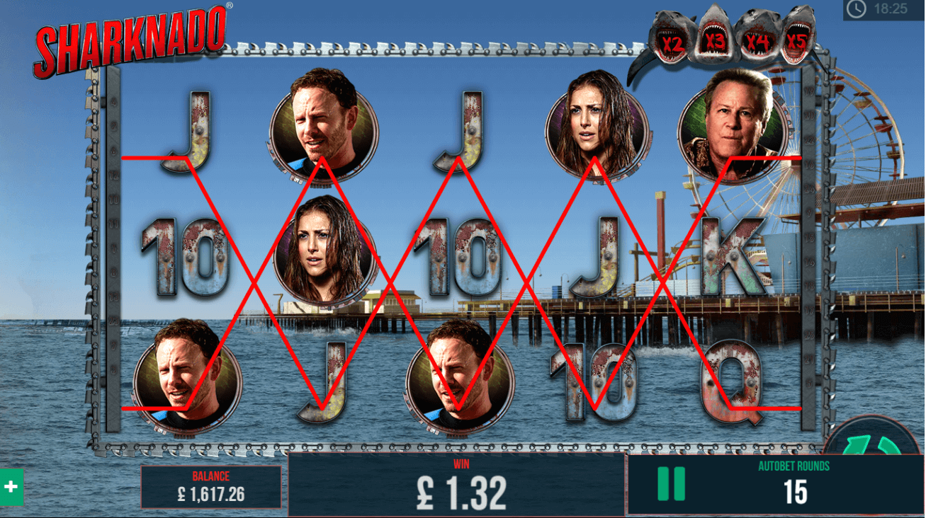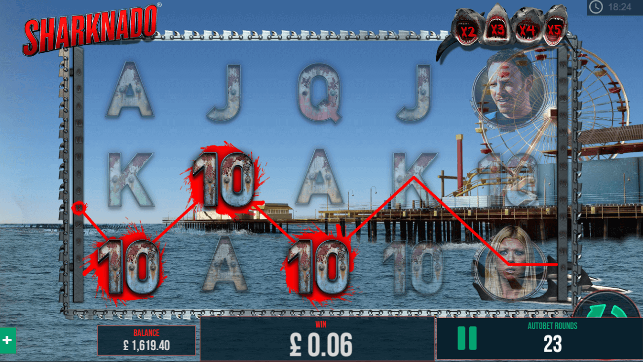 If you see three or more motor saw symbols, it will activate the Sharknado free spins feature. For three, four, and five scatter symbols, you will get up to 10, 15 and 20 free spins respectively.