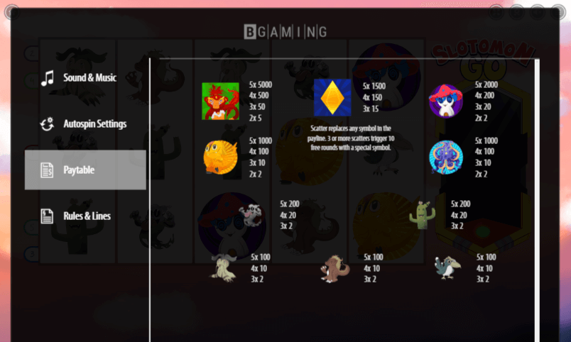 Slotomon Go slot grounded on Animal theme, though you will be able to notice aspects of Wild, Battle, Asian, Fantasy, TV, Cartoon thematics too. Undoubtedly, if you are keen on some of latter online slot themes – experience from discovering all features of this slot machine will be really outstanding.