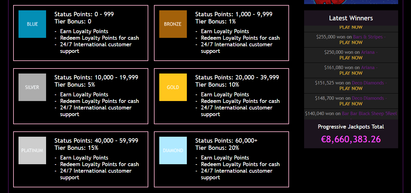 Playfina’s VIP system is one of the most distinctive parts of the casino. The program includes 175 levels, and each level unlocks some form of reward: cash, free spins, better cashback, higher limits or more tailored offers. Progress is tied to wagering real money, so active players naturally climb the ladder over time.