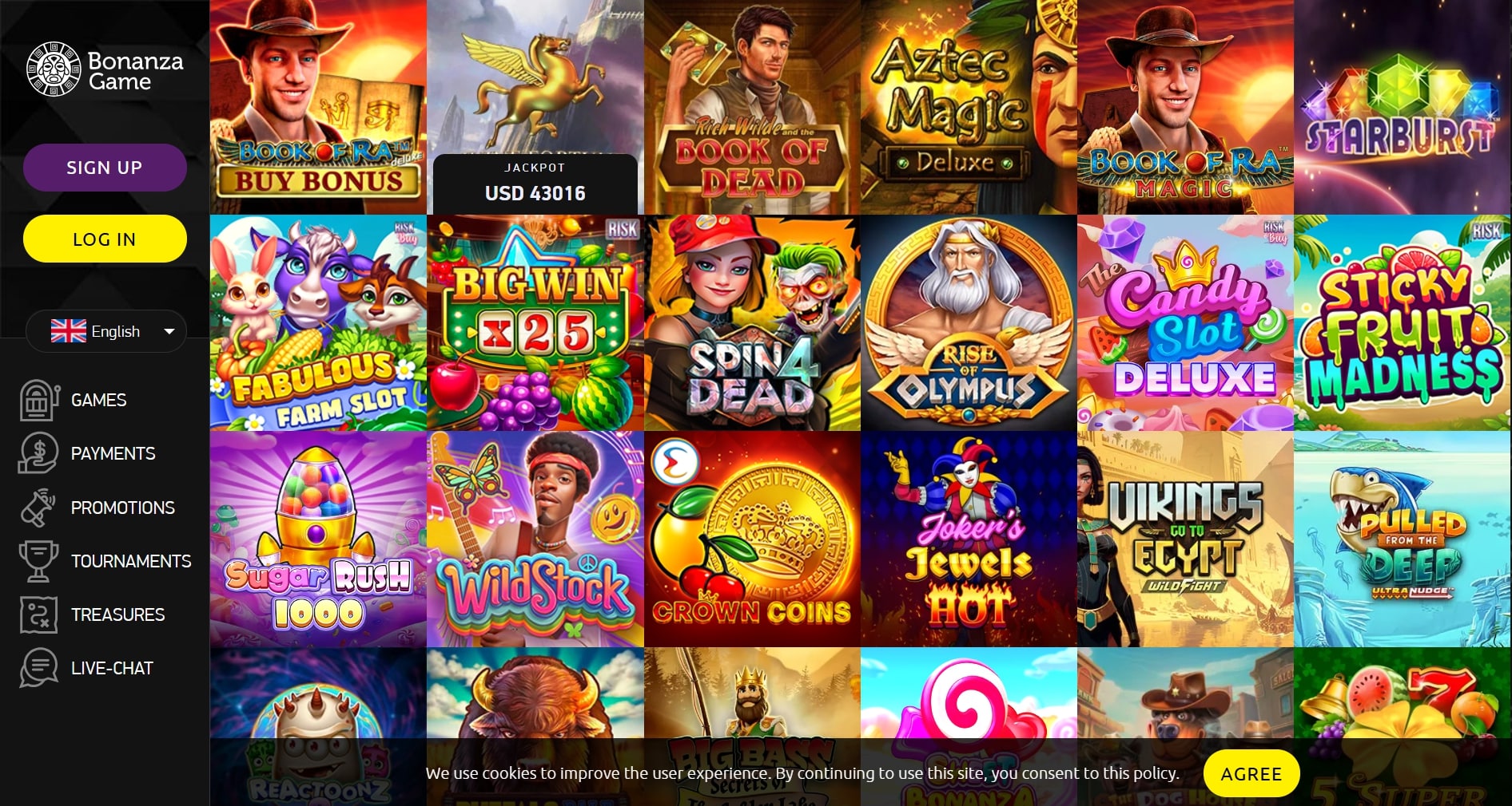 Sugar Rush, Gates of Olympus, Book of Dead, Big Bass series |
