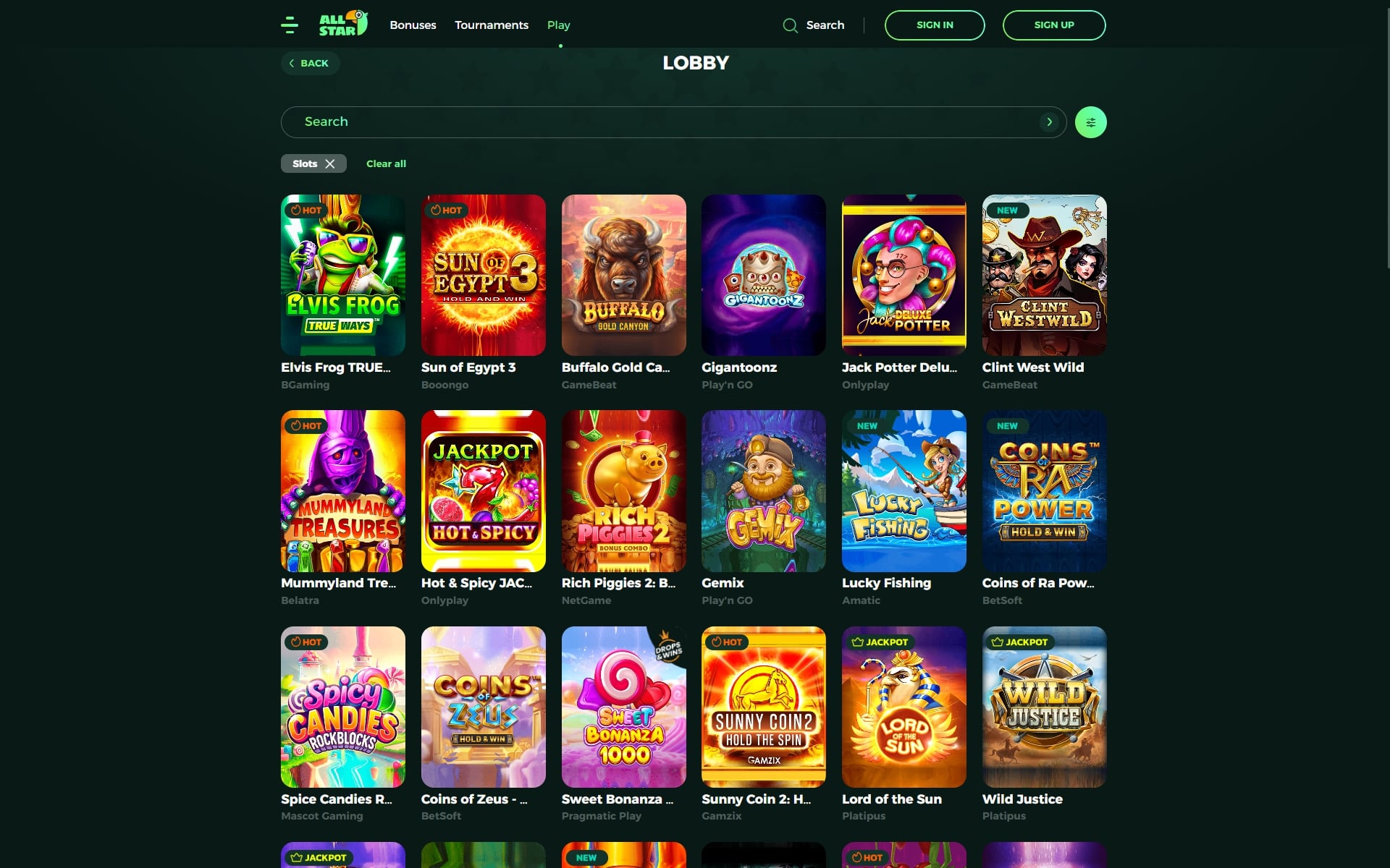 All Star’s lobby is split into Slots, Table Games, Live Casino, Slingo, Crash, and Jackpots . A slick filter bar lets you sort by provider, volatility or feature.