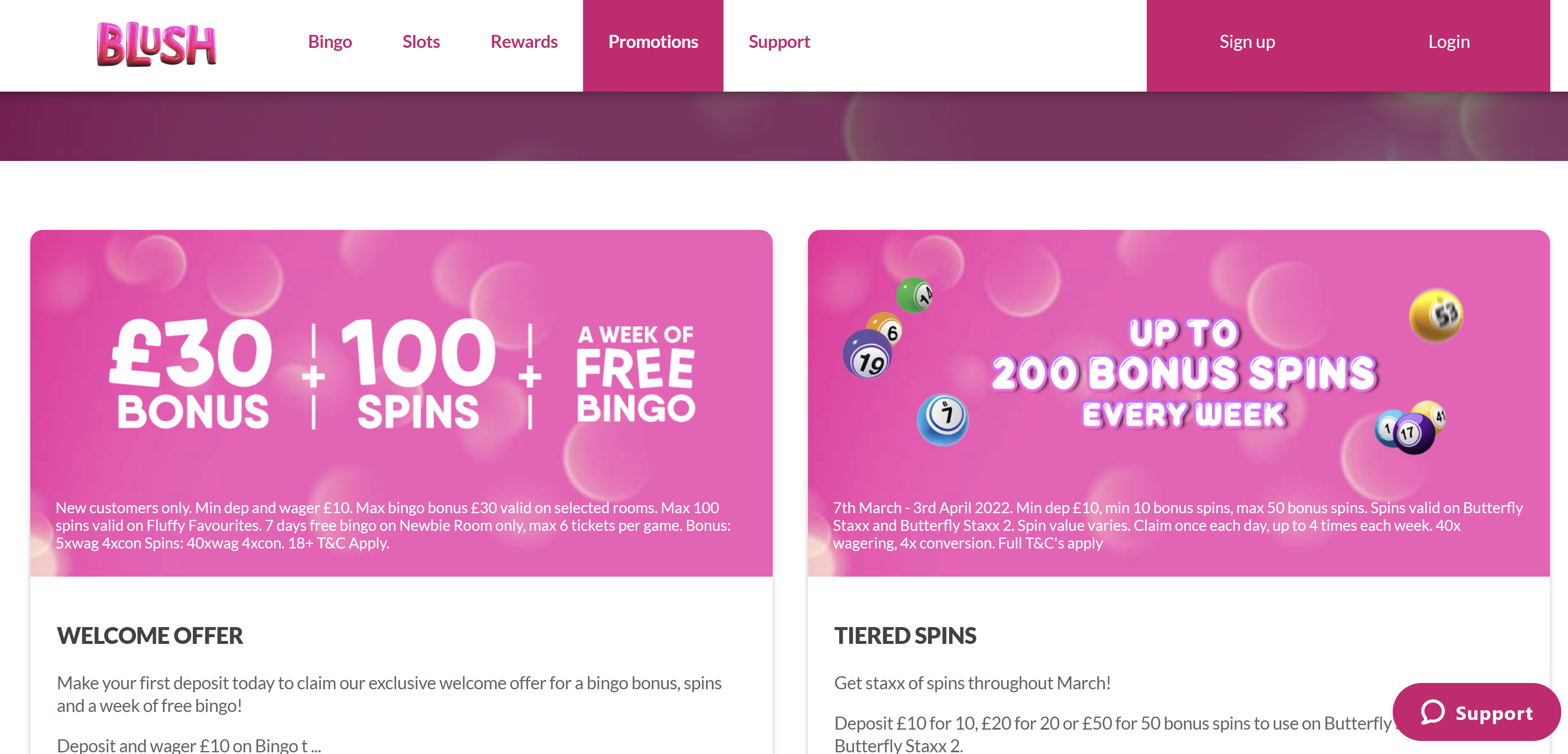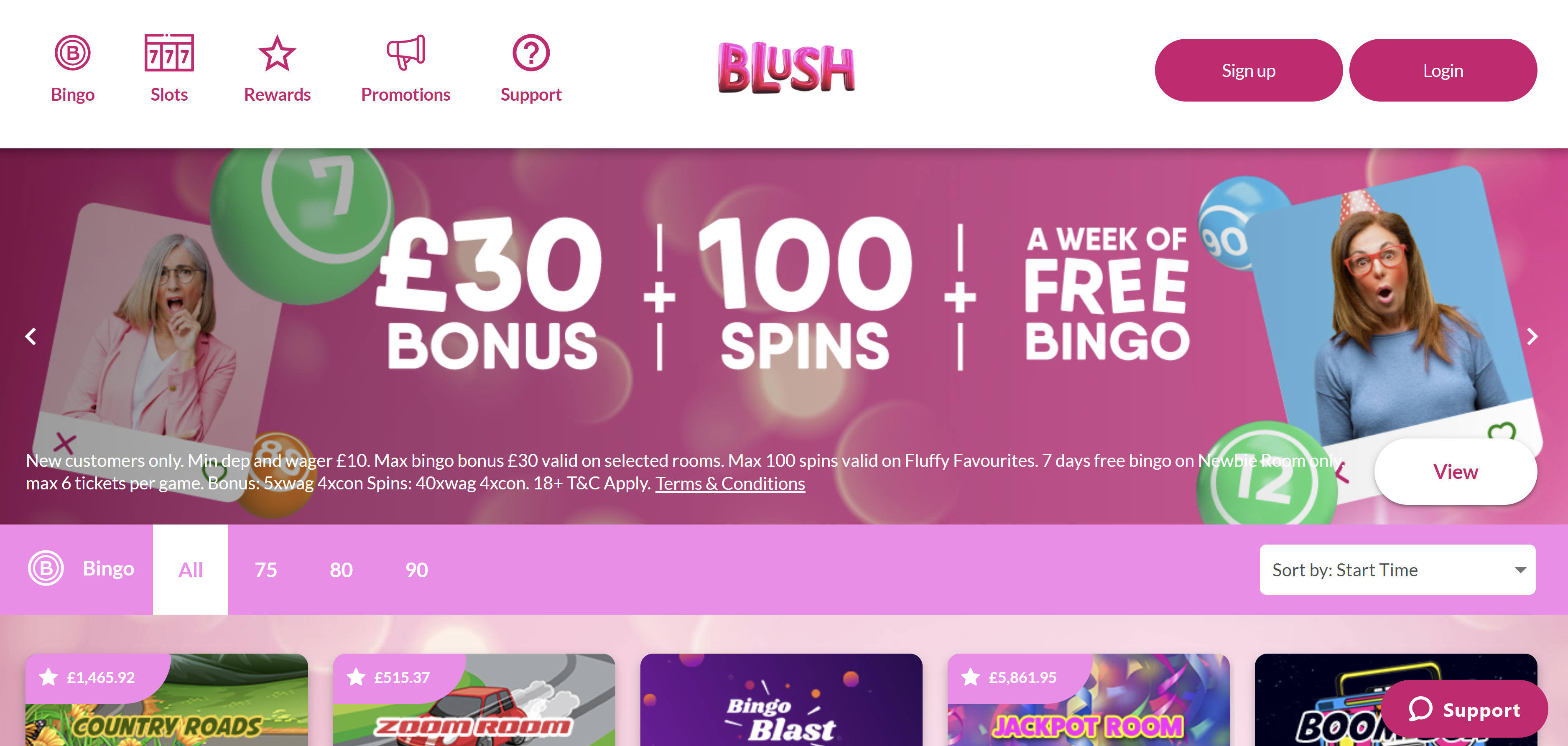 As soon as you open your account in Bingo Blush casino, you get a welcome bonus consisting of Blush Bingo free spins and exclusive bonus codes. Players who deposit a minimum of €10 will get €30 cashback and 100 free spins. You also get exclusive Blush Bingo bonus codes of one week of free bingo and a chance to play Fluffy Favourites in the newbie room.