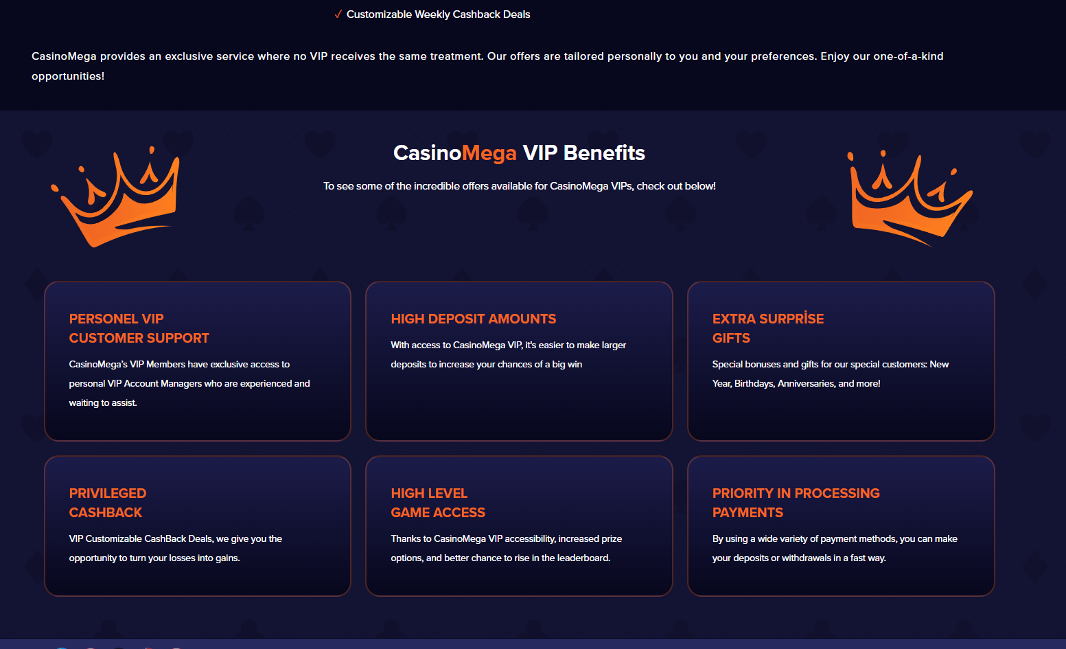 Whether it’s the enhanced deposit limits that let you play the high stakes or the privileged cashback options turning losses into opportunities, the VIP club is designed to elevate your experience. With special access to high-level games and priority in payment processing, the VIP status isn’t just a title, it’s a passport to the premier league of gaming at CasinoMega.
