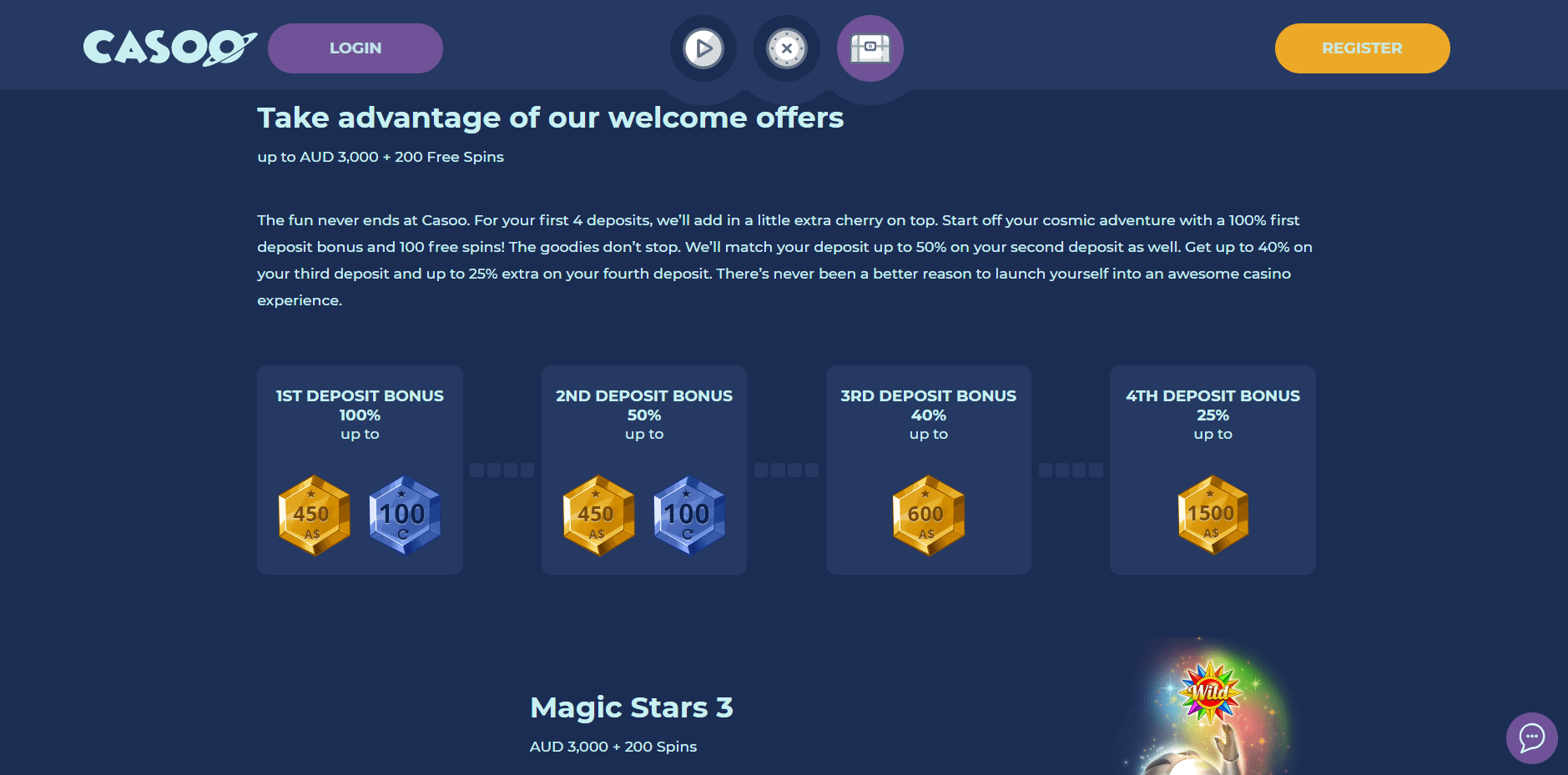 Casoo Casino matches the first deposit with a 100% bonus and 100 Casoo Casino free spins to keep players amidst never-ending profits. Your second deposit will be augmented by another bonus potent to be up to 50%. The third deposit means yet another bonus of up to 40%. In contrast, your fourth one will make you stumble upon another bonus capable of being as high as 25%. Besides, there’s no need to claim these bonuses with Casoo Casino bonus codes.