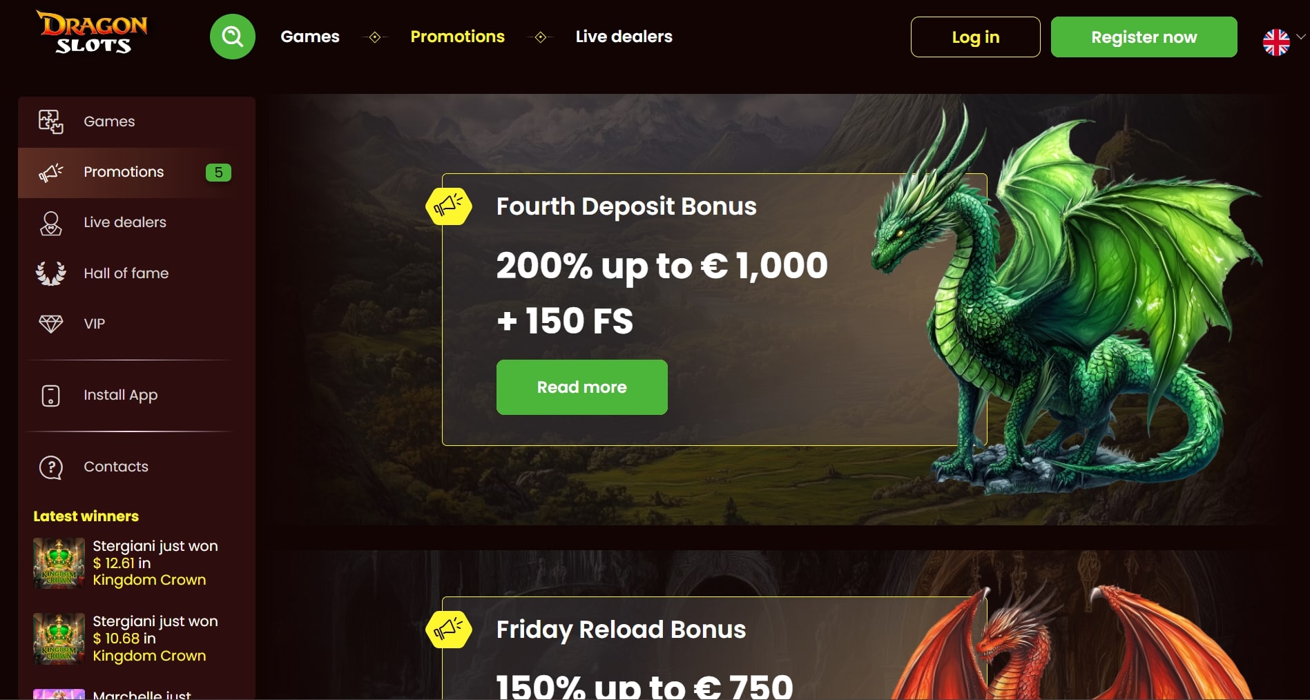 DragonSlots features a 50-level VIP program with progressive rewards. Each level unlocks perks like deposit bonuses, cashback, higher withdrawal limits, and tailored promos. The final level promises up to €100,000 in extra cash—ideal for dedicated enthusiasts and high-stakes gamers.