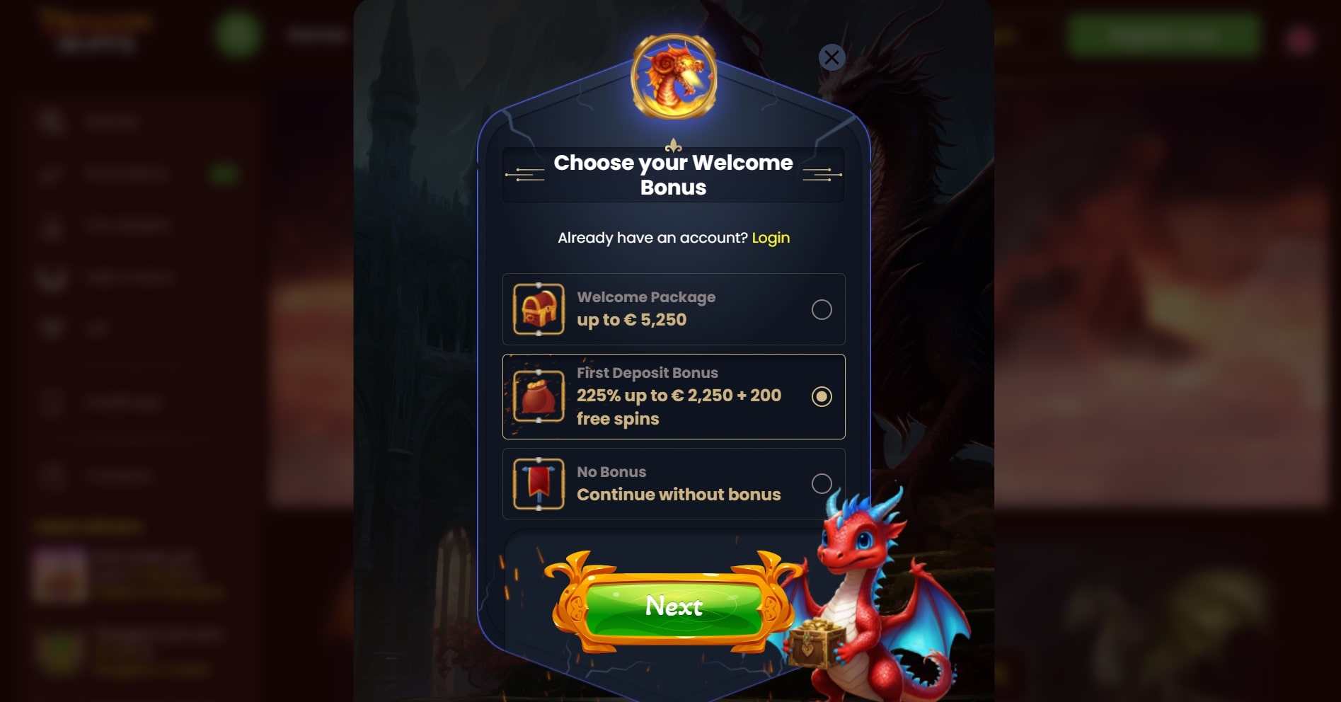 DragonSlots offers a range of enticing promotions, starting with a comprehensive four-part welcome package. Below is a detailed table outlining the main bonus offers: