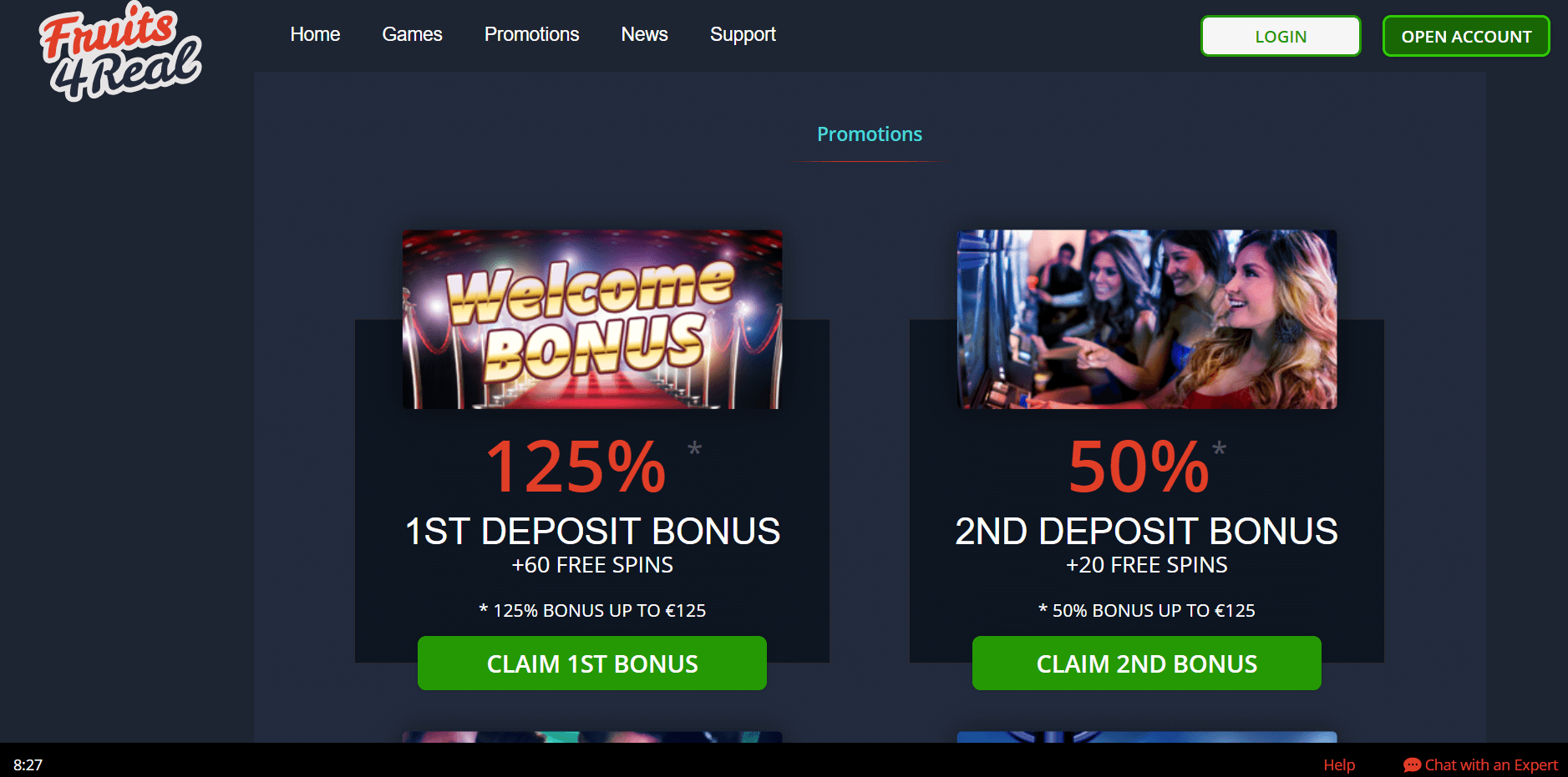 You get a 125% bonus for the first deposit with 60 free spins. You can win 20 Fruits4Real casino free spins and a 50% bonus for a second deposit. Those who make third consecutive deposits will get a 50% bonus alongside 20 free spins.