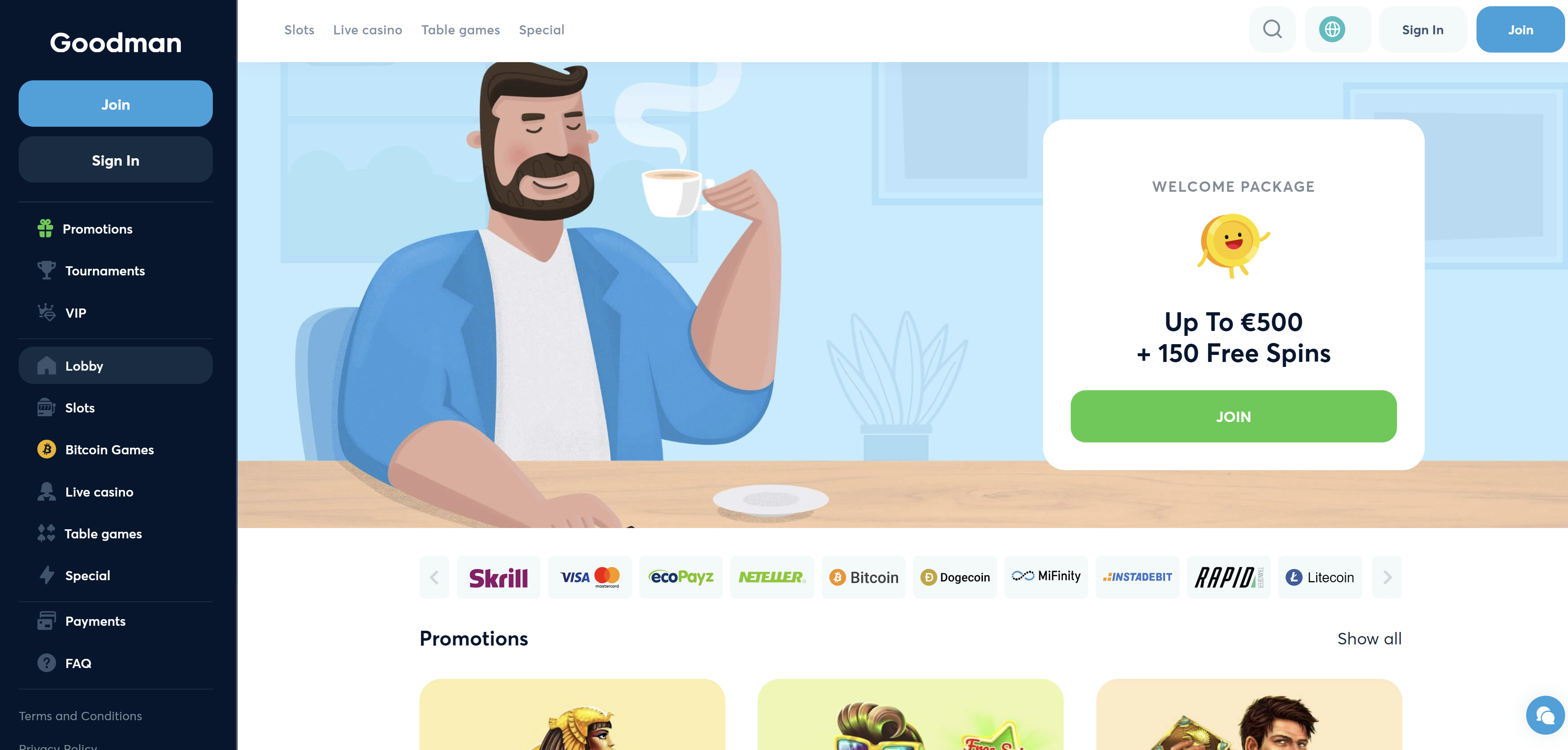 Goodman Casino allows players with a wide range of possibilities to make their fiscal transactions convenient. For example, you can use CoinsPaid, VISA, Maestro, Bank Paysafecard, Neteller, Skrill, etc.