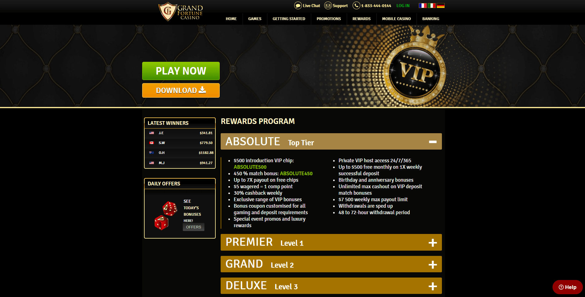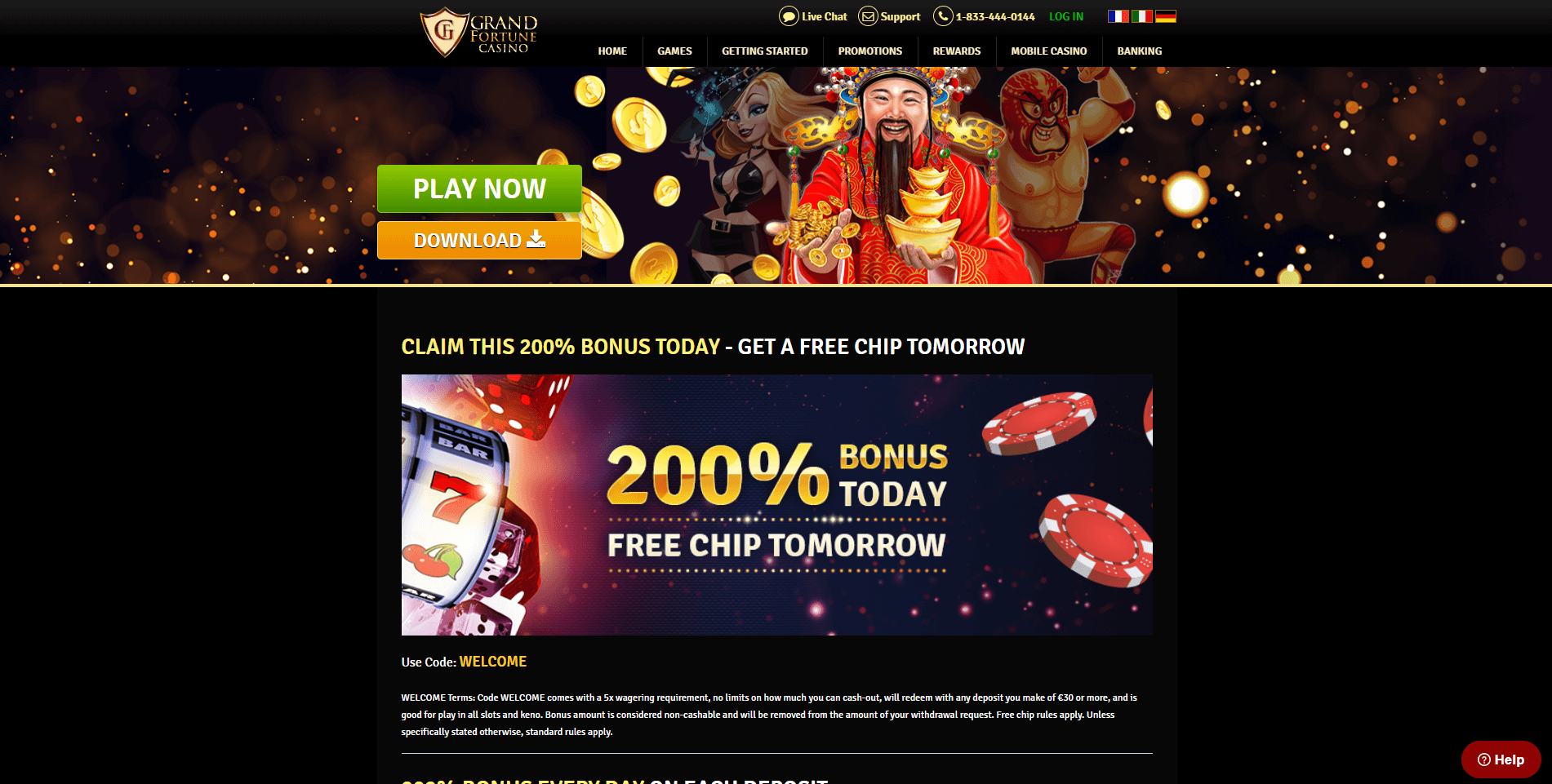 Grand Fortune Casino is a reputed casino, offering all sorts of casino games from the house of Realtime Gaming. It promises a breathtaking experience to its players by casino guaranteeing the best slot games. You can use the instant play option or download the free casino software.