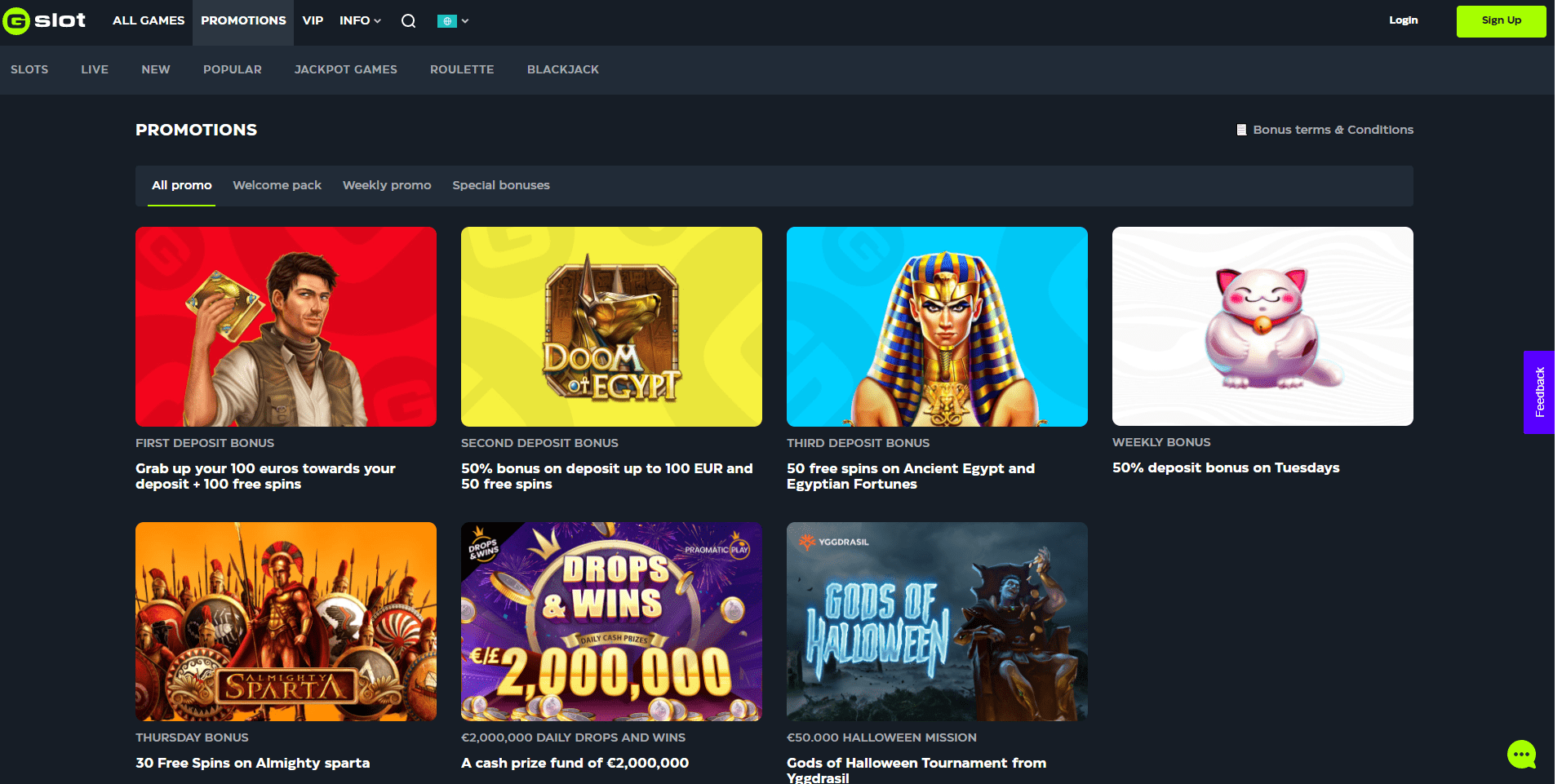 GSlot Casino welcomes you with incredible bonus offers. By making your first deposit, you become eligible for the welcome bonus package. Make your first deposit and receive 100 Euros along with 100 free spins. You can get 50% up to 100 Euros for the second deposit along with 50 free spins. Go for a third deposit, and you get 50 GSlot Casino free spins.