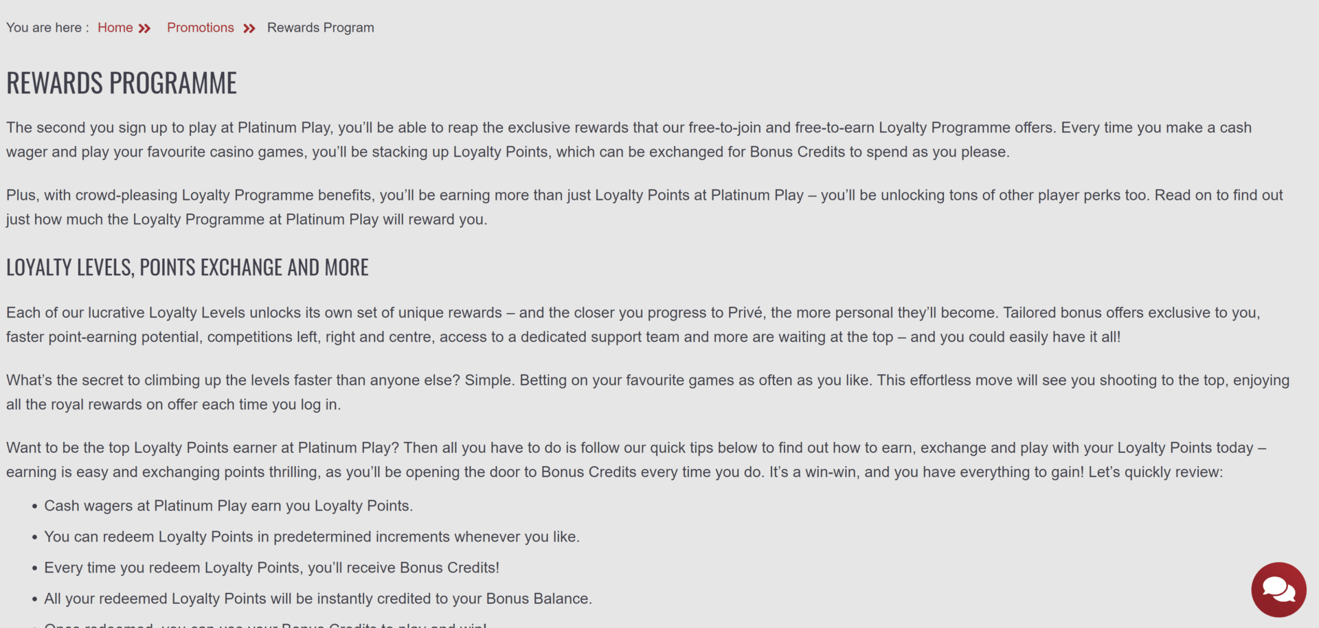 Players are added to the loyalty program automatically when they join. Platinum Play rewards 2,500 points, which puts you in the Bronze level. You collect more ranking units by playing more games. You can exchange it for Platinum Play credits if you get enough loyalty points.