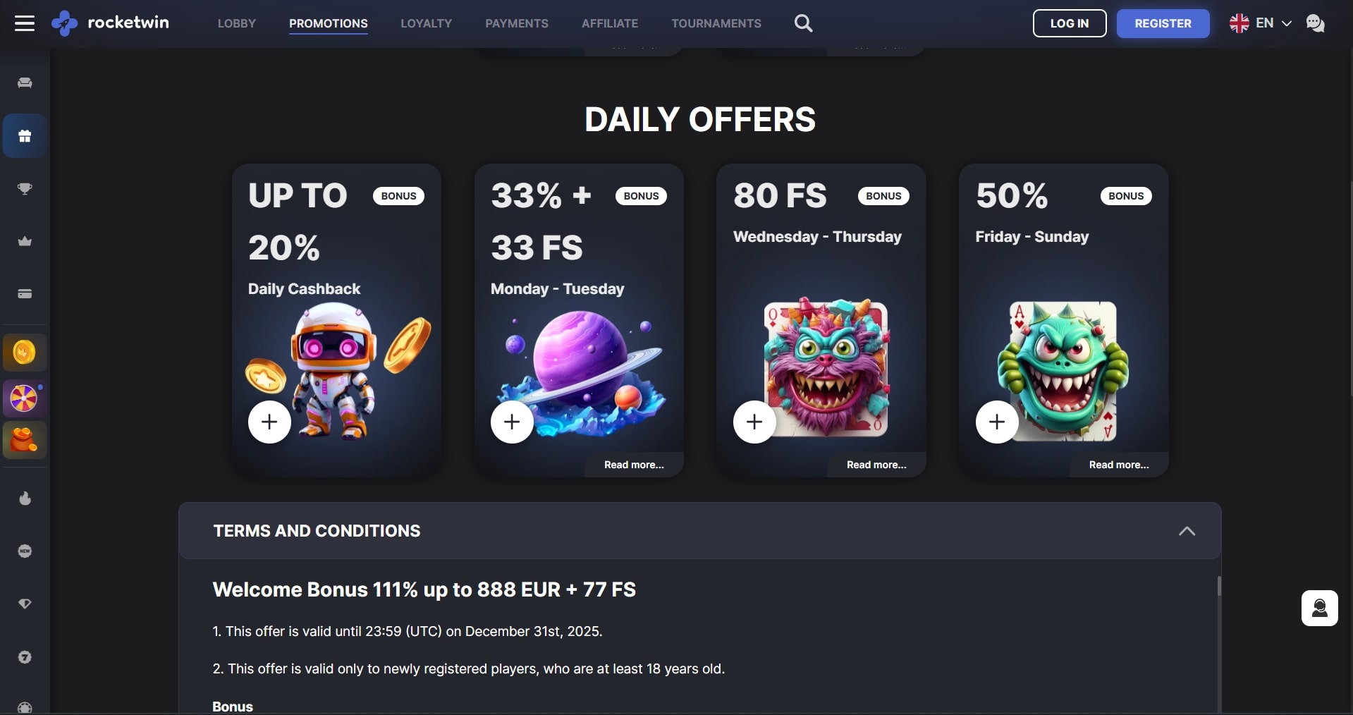 Below you’ll find a snapshot of RocketWin’s main bonuses. Note that details might change, so always check the official Promotions page for the latest info.