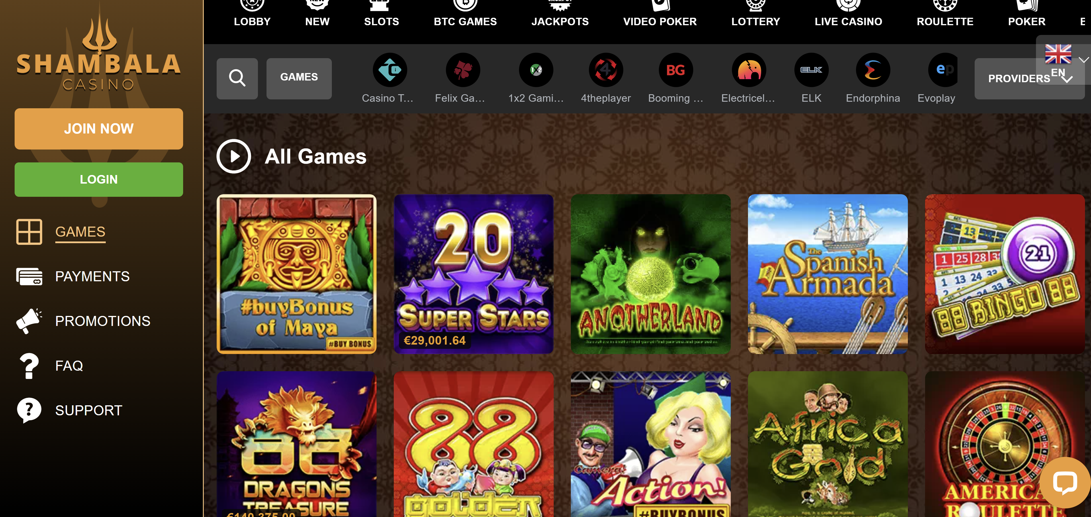 At Shambala Casino, players can enjoy over 4000 titles and games across all popular categories. The casino has partnered with top game developers such as Microgaming, Yggdrasil, 1×2 Gaming, GameArt, Blueprint, and Booming Games, among others. The games are available in categories such as slots, BTC games, jackpots, video poker, lottery, and live casino.