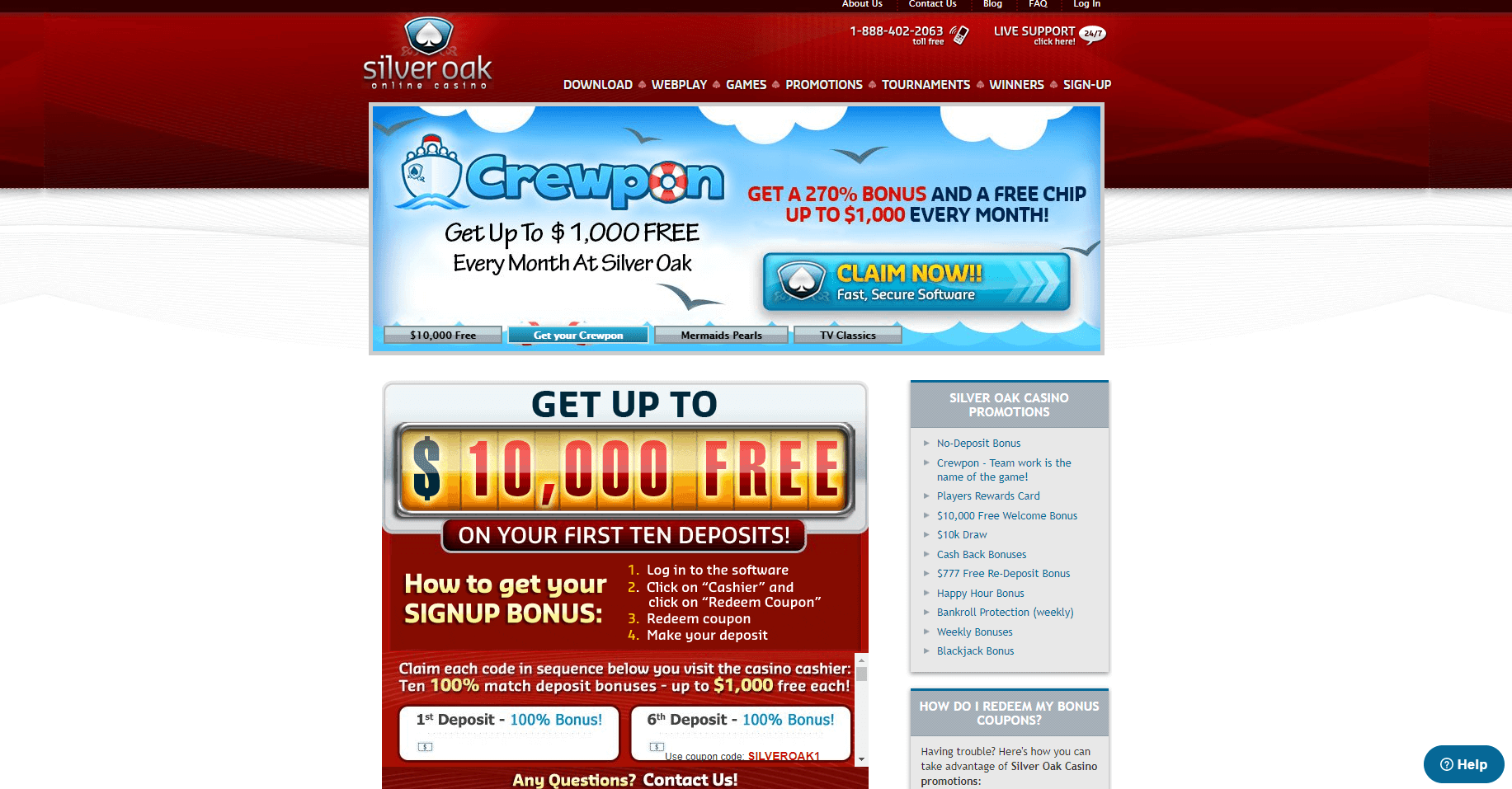 The casino offers a generous welcome package for new players, providing an opportunity to win up to $10,000 on their first 10 deposits. Upon the first deposit, players can receive a 100% bonus up to $1,000 by using the coupon code SILVEROAK1. For the 2nd to 10th deposits, players can receive 100% bonuses up to $1,000 each by using Silver Oak bonus codes such as SILVEROAK2, SILVEROAK3, SILVEROAK4, SILVEROAK5, SILVEROAK6, SILVEROAK7, SILVEROAK8, SILVEROAK9, and SILVEROAK10, respectively.