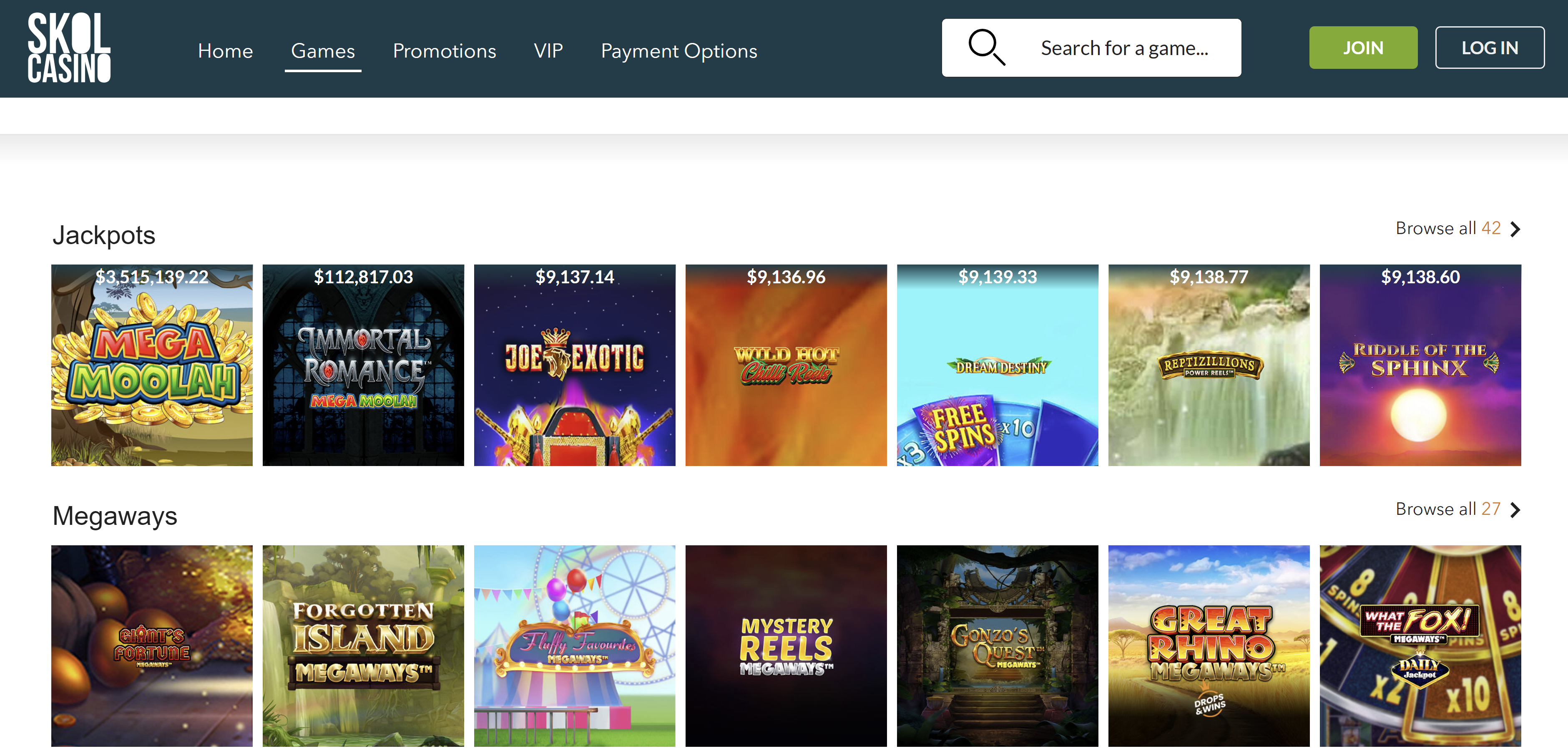 Skol Casino has the most comprehensive range of software providers that power 1,788 games on this portal. To make it easy for the players, all the games are divided into nine categories: New Games, Slots, Jackpots, Live Casino, Blackjack, Roulette, and Scratch.
