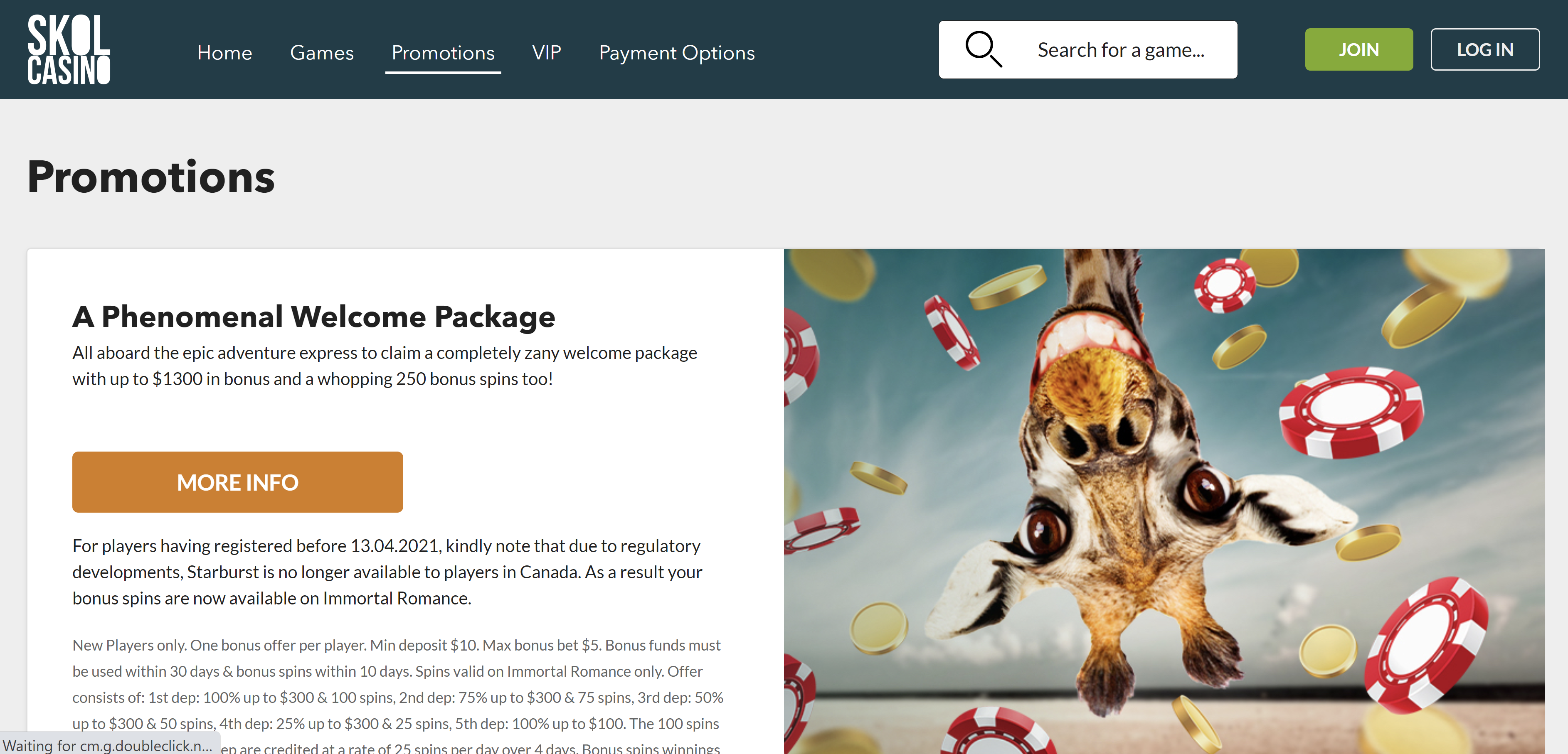 The welcome bonus at Skol is covered over the first four deposits. The total cash amount players can win is €1300. Players can win a 100% bonus up to €300 + 100 Skol casino free spins on the first deposit. The second deposit offers a 75% bonus up to €300 + 75 free spins.
