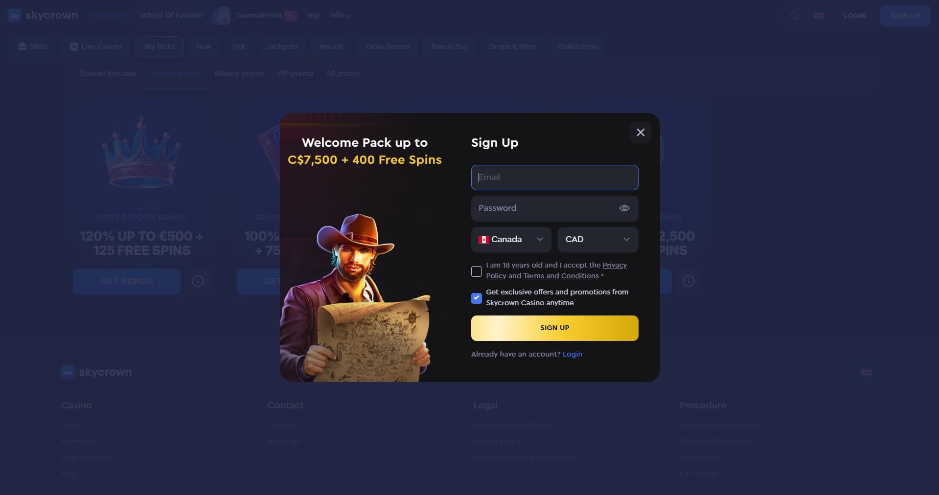 Skycrown Casino rewards new players with an outstanding Welcome Package: 100% Up to 8000$ + 400 Free Spins – bonus terms apply, with an estimated minimum deposit of $20.
