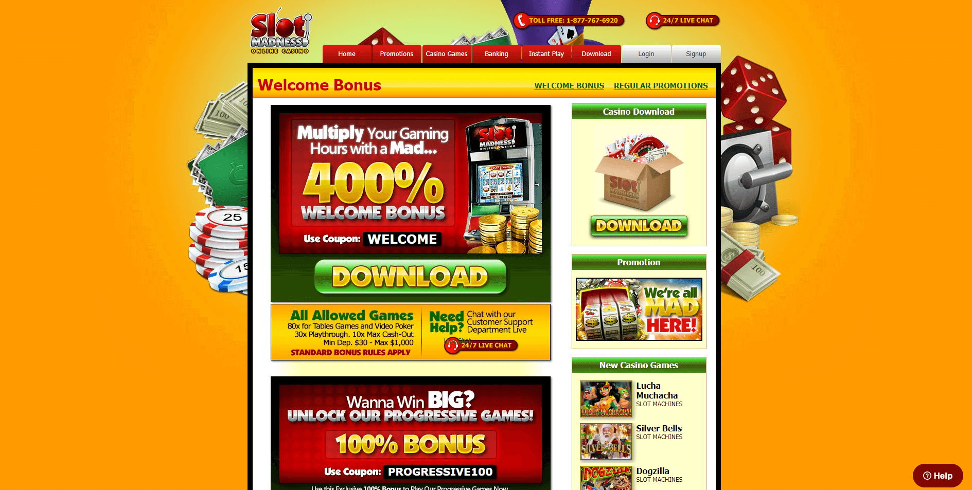 Upon signing up with Slot Madness casino, players can receive a generous welcome bonus package of up to $2,750, with a 275% match bonus. If players wish to extend their gaming experience, they can receive a 400% welcome bonus with a minimum deposit of $30. The casino also offers a maximum cash-out of 10x for all allowed games.
