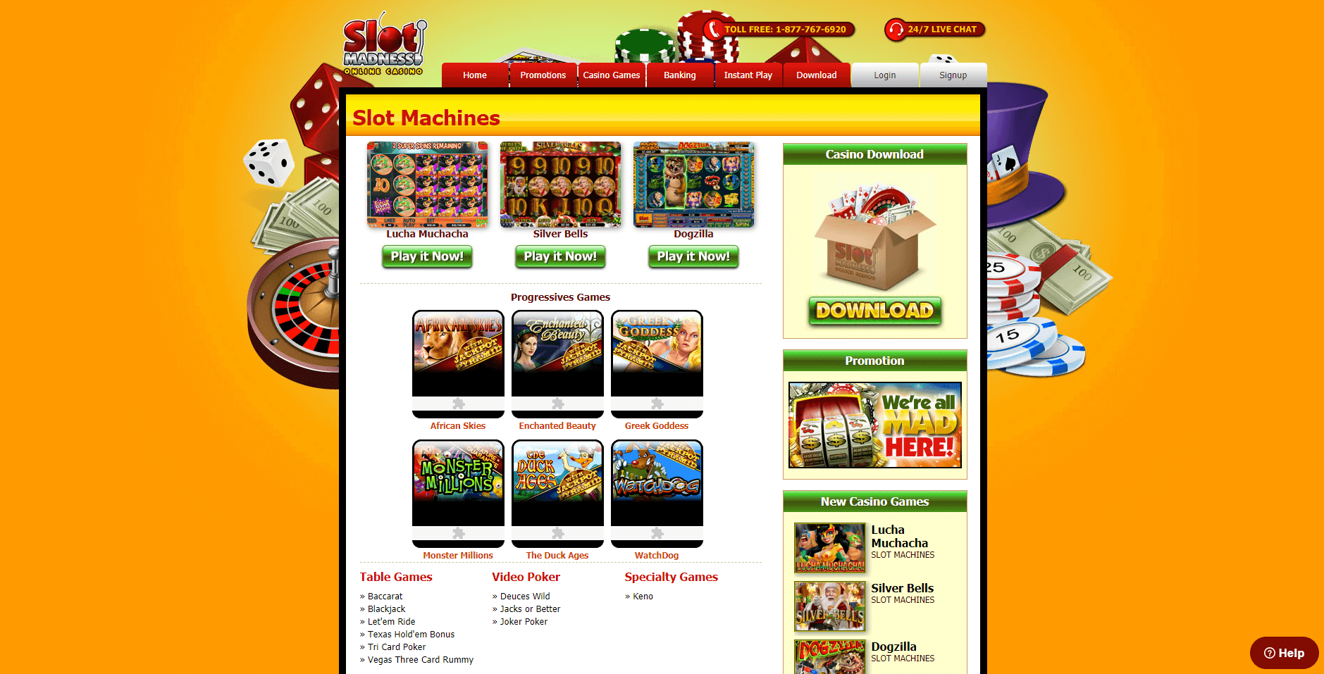 At Slot Madness casino, players have access to a wide selection of over 130 online casino games powered by Real Time Gaming software. The instant play feature provides a remarkable lobby of online slots, table games, specialty games, top games, and video poker.