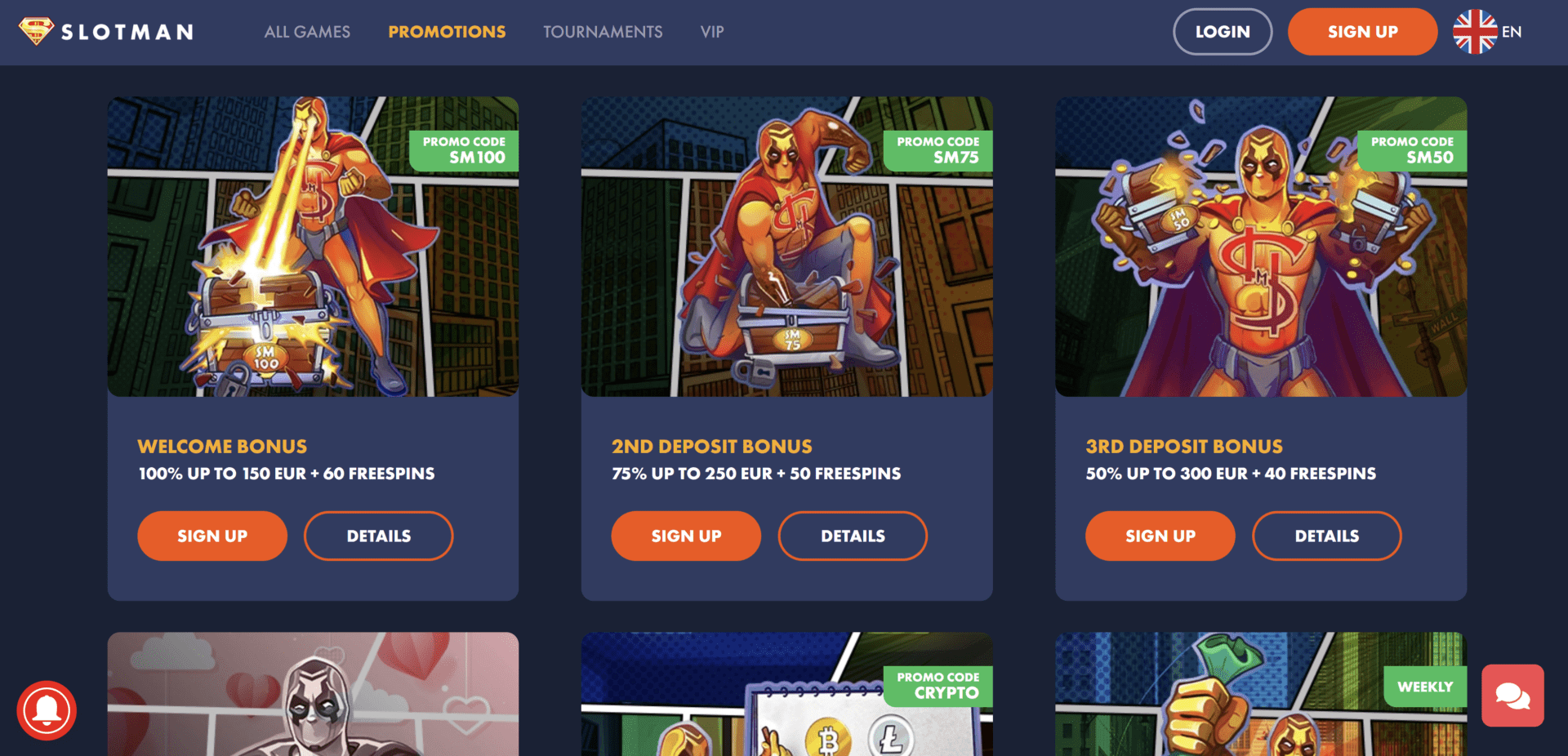 New players are in for a treat with Slotman Casino’s generous welcome bonus. Players can win up to €700 and 150 free spins after signing up. Moreover, the casino has subsequent promotions, free spins, and bonus codes to benefit its players. After the first deposit, players can get 100% up to €150 and 60 free spins using promo code SM100. The second deposit can win 75% up to €250 and 50 free spins using promo code SM75, while the third deposit using Slotman casino bonus code SM50 wins 50% up to €300 and 40 free spins.