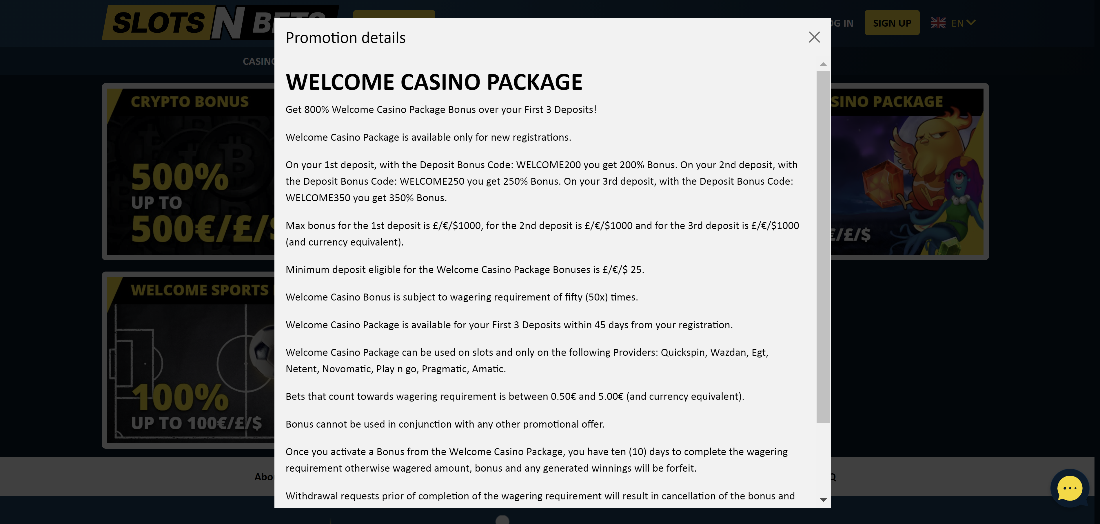 At SlotsNBets Casino, new players are welcomed with enticing bonus packages, including free spins. The casino offers an 800% bonus over your first three deposits. In the first deposit section, you can claim a 200% bonus with the code WELCOME200. Similarly, you can get a 250% bonus on your second deposit with the code WELCOME250, and a 350% bonus on your third deposit with SlotsNBets casino bonus codes WELCOME350.