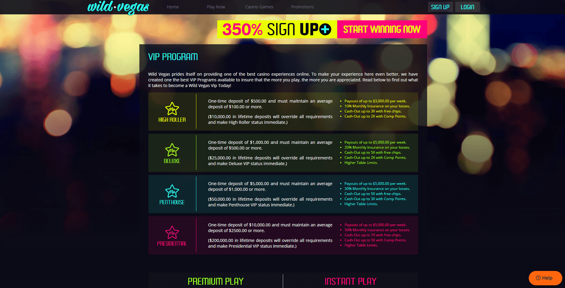 Those who have been informed about Wild Vegas casino will undoubtedly agree that it boasts an impressive range of online slot machines, table games, video poker titles, and specialty games. This modern-day casino offers players two options for enjoying its offerings: Instant Play and Premium Play. While the Premium Play option allows players to access over 50 casino games, the downloadable software-based Premium Play option offers access to 150+ casino games.